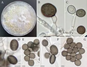 A colonia sobre MEA. B-F Célula conidiógena formando conidios. G Conidios. Escala: B-G 5 µm.