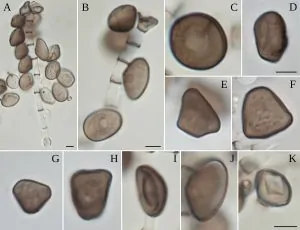 A-B Conidioforos y conidios; C-K Conidios en vista frontal y lateral. Escala: A-B 20 µm; C-K 5 µm.