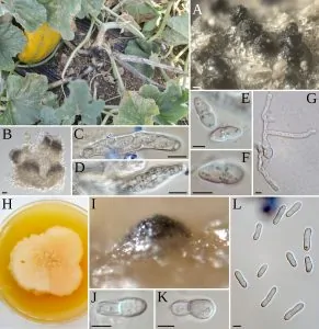 Upper left part lesions on the stem and leaves, A Host pseudotheory group, B Pseudothecium under the microscope, C-D Asci with ascospores, E-F Ascosporas, G Ascospora germinated, H Cologne in MEA 2%., I Pycnidium on host, J-K Conidia emerging from the conidiogenous cell, L Group of conidia.