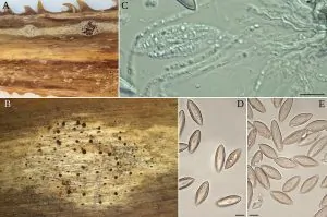 Imagen 2: A-B Estromas de Cocoicola califórnica mostrando masas de ascosporas. C Ascos y parafisis. D-E Ascosporas estriadas.