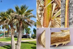 Imagen 1: A Washingtonias con las hojas antiguas atacadas. B-C Raquis afectado. D Tejido vascular infectado. E Estroma mostrando la salida de las ascosporas.