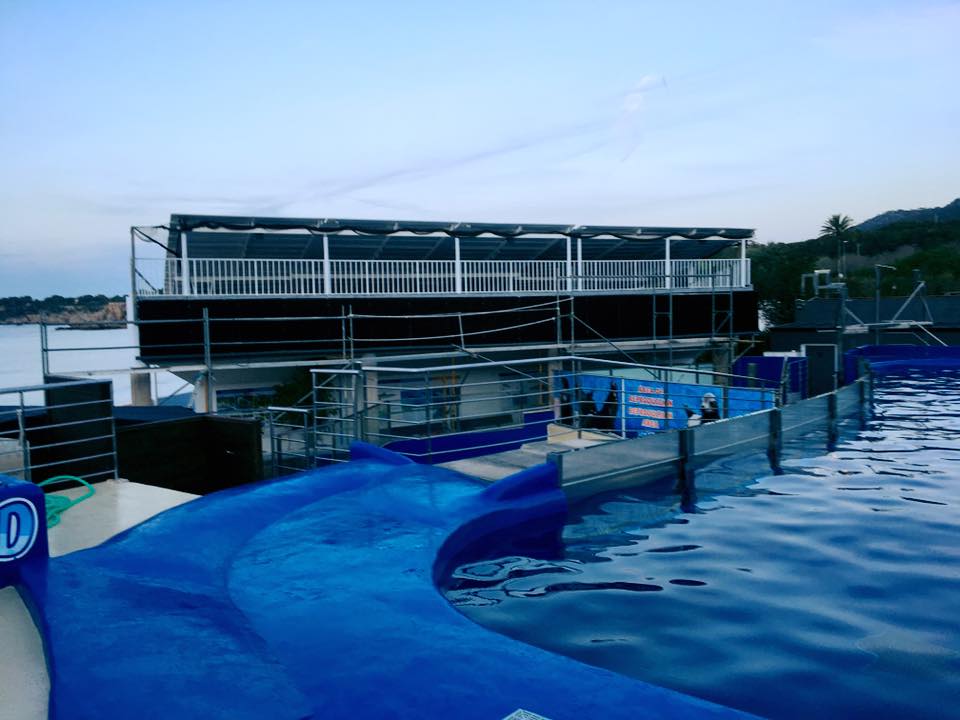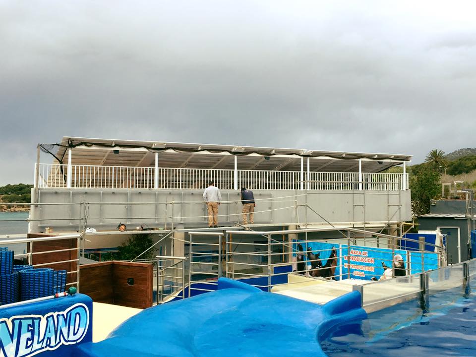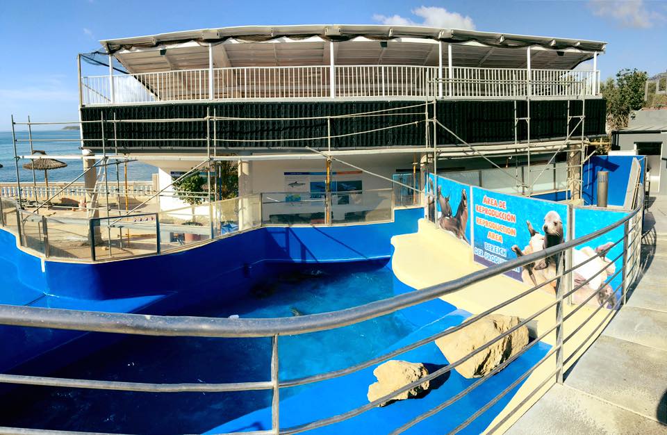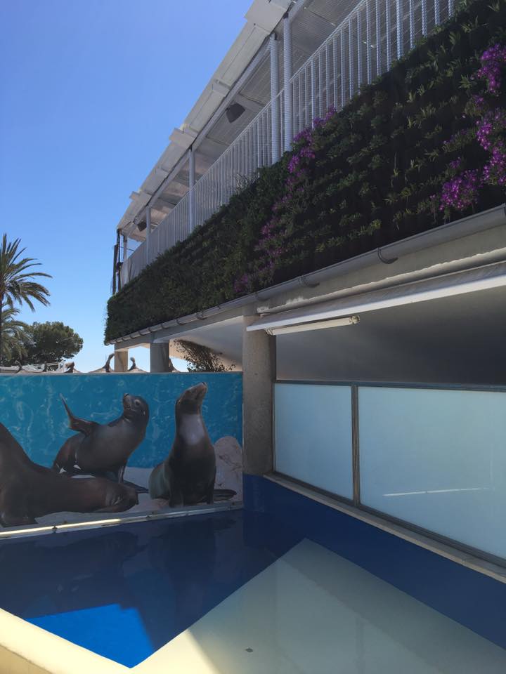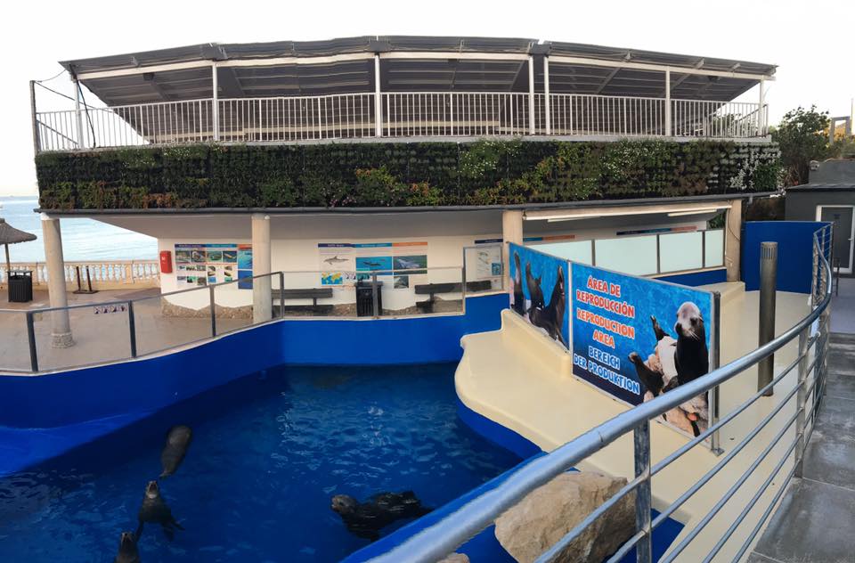 Instalaciones de un acuario con piscina para lobos marinos y área de reproducción, con jardín vertical en la parte superior